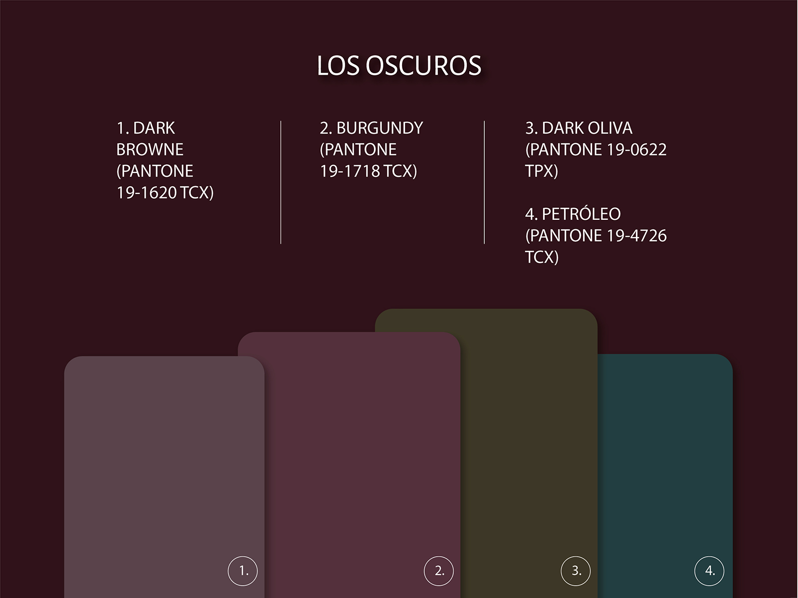 LOS OSCUROS: Los tonos oscuros de esta temporada adquieren nueva profundidad con matices de marrón, caqui, azul y rojo, reinventando el negro en las colecciones. Estos tonos estructuran siluetas, crean contrastes e intensifican la profundidad de la superficie.